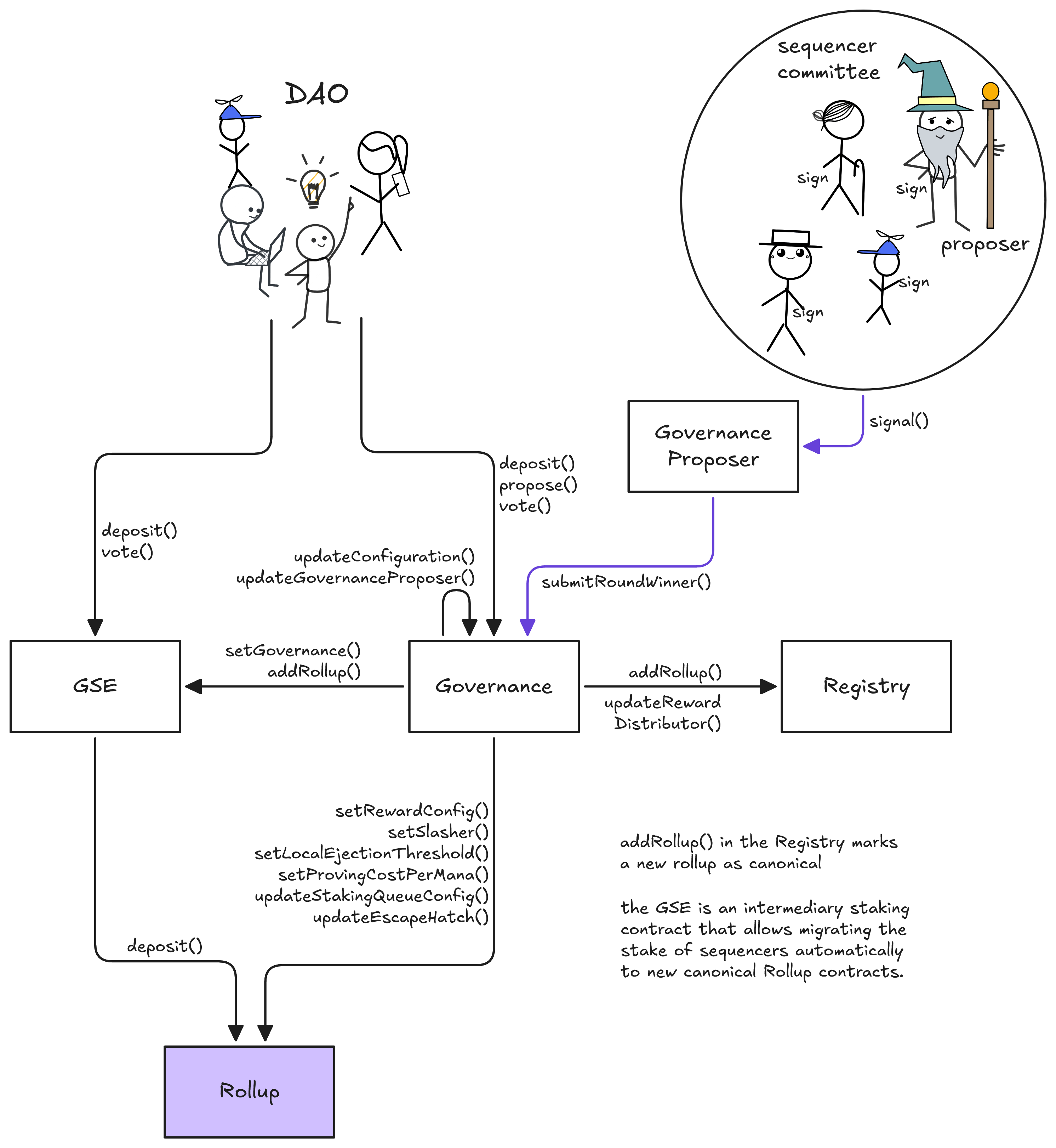 Central staking manager independent of Rollup implementations. Sequencers deposit stake here through their chosen Rollup contract. Their stake is then transfered to the Governance contract and activated for voting. The GSE tracks which rollup instance validators are securing, and gives them an option to automatically move to the latest Rollup version.